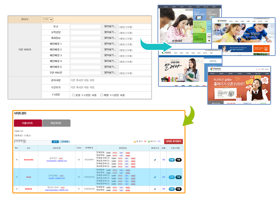 관리자 페이지의 사이트관리에서 원스톱 방식으로 사이트를 생성하고 각각의 사이트별로 관리자 기능을 부여할 수 있습니다.